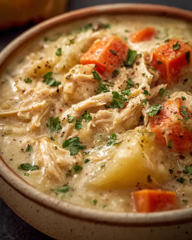 A comforting soup that combines the classic flavors of chicken pot pie with a creamy twist, perfect for chilly days or cozy family dinners.