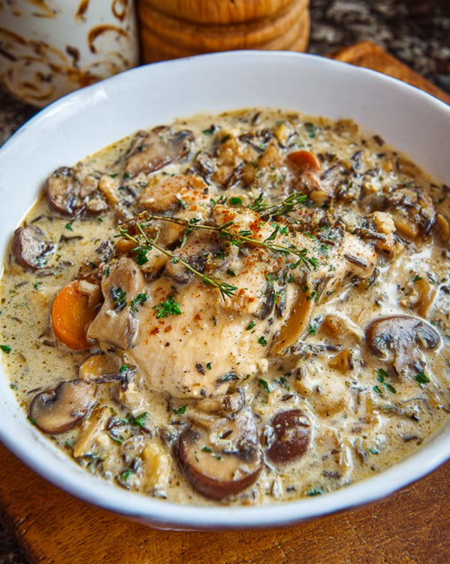 A comforting dish featuring tender chicken in a rich, creamy sauce with earthy mushrooms and nutty wild rice.