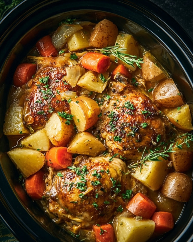 A comforting dish featuring tender chicken, hearty vegetables, and aromatic herbs, all cooked to perfection in a slow cooker.