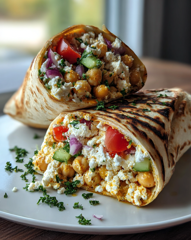 Quick, healthy, and delicious wraps packed with chickpeas, fresh vegetables, and creamy feta cheese, all wrapped in a whole wheat tortilla.