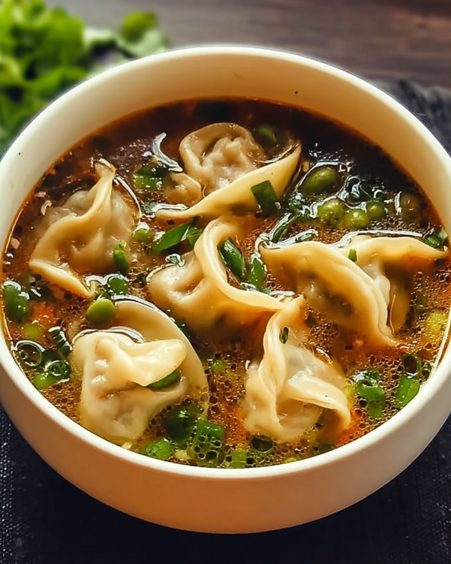 A delightful dish that combines the comforting flavors of traditional potstickers with a warm, savory broth, featuring tender dumplings filled with ground meat and vegetables.