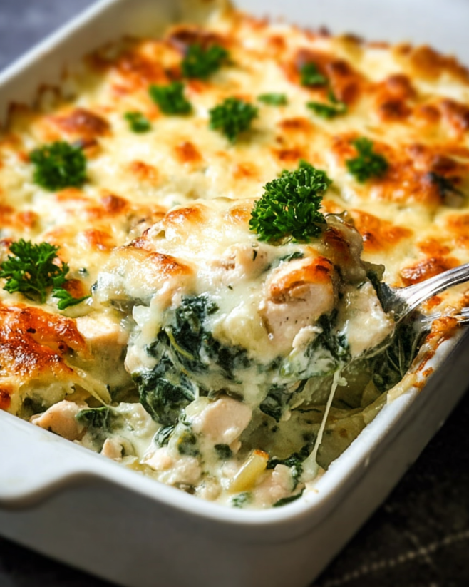 Creamy Chicken Spinach Casserole is a family favorite.